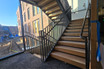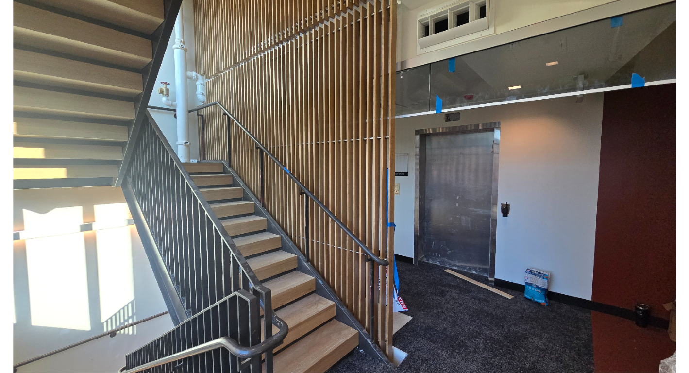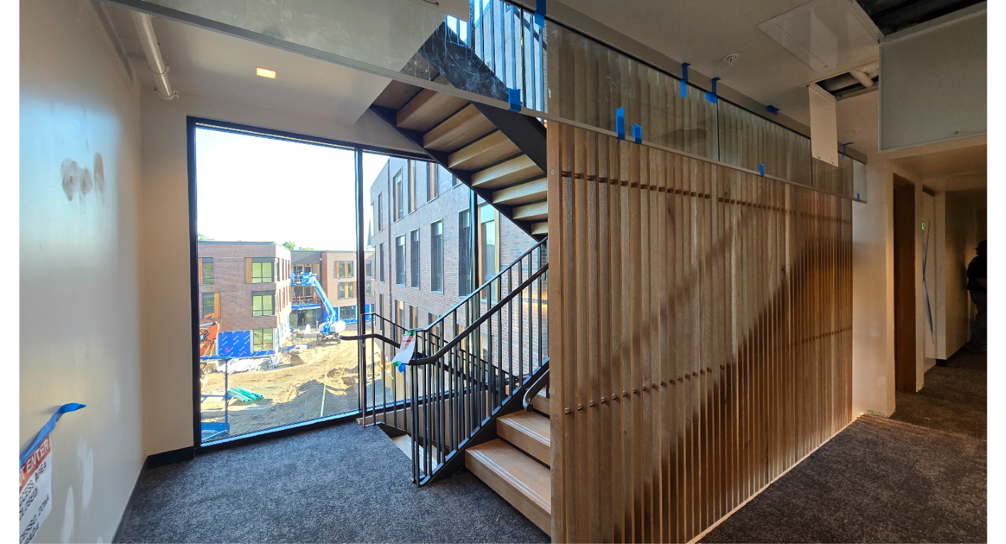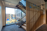 One of the many challenges of this project was the slatwall system inside the staircase. This slatwall continues up four floors of stairwell, and the entire installation is mounted to the inside of the stairwell using stainless steel plates and lag bolts. The challenge of this system is figuring out best how to modularize it, where to start, and where to end, to ensure that the final look is achieved, while maintaining the ability to maneuver it into place.